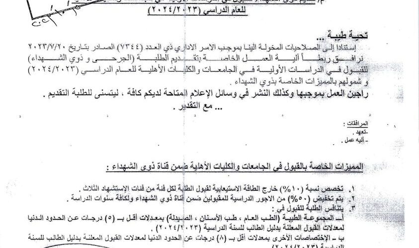 ضوابط قبول ذوي الشهداء في الدراسات الجامعية